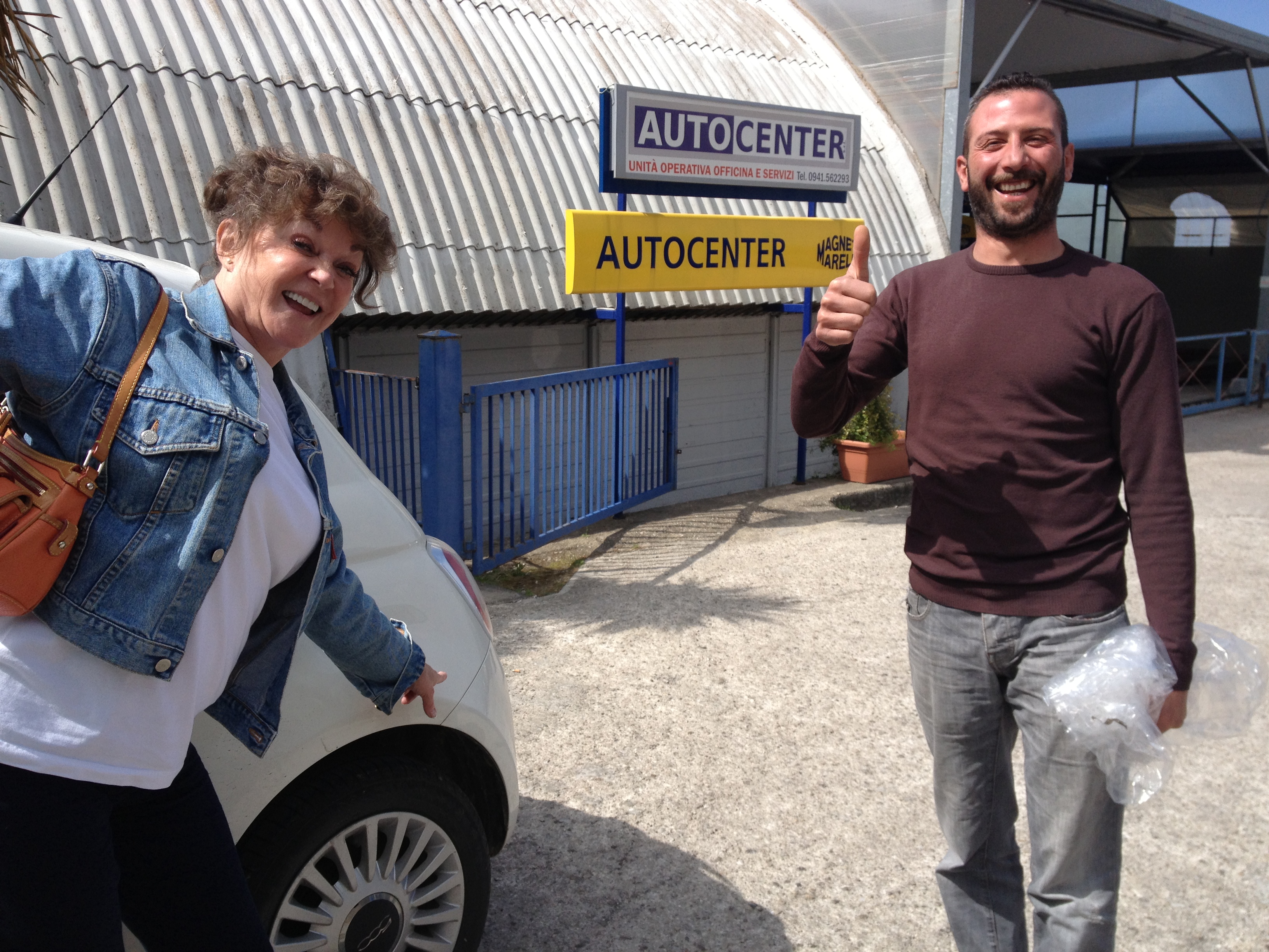 Our Fiat is narrow, but the streets of Western Sicily are narrower. Result: large scratch. Today, Guido reduced the scratch to niente.