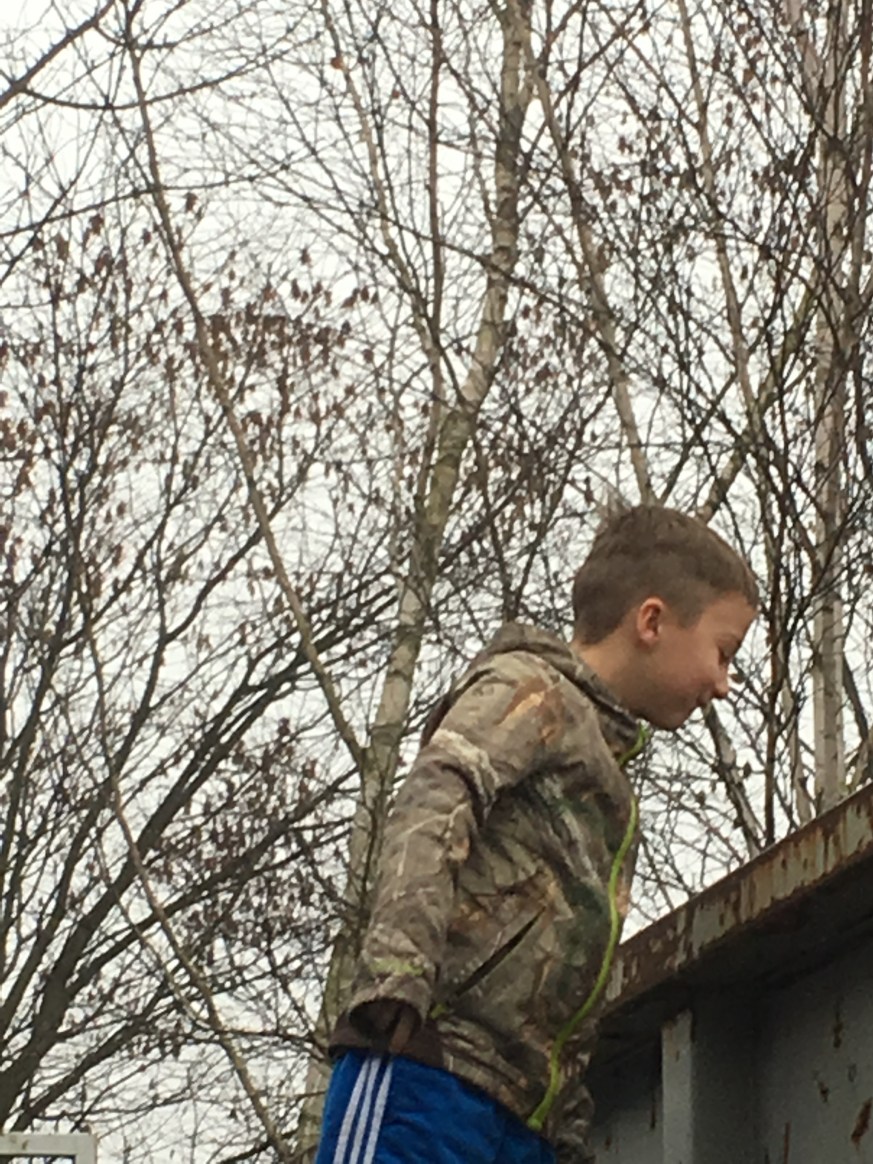 Gus, pleased with his bottle toss into the appropriate (white-only) dumpster.