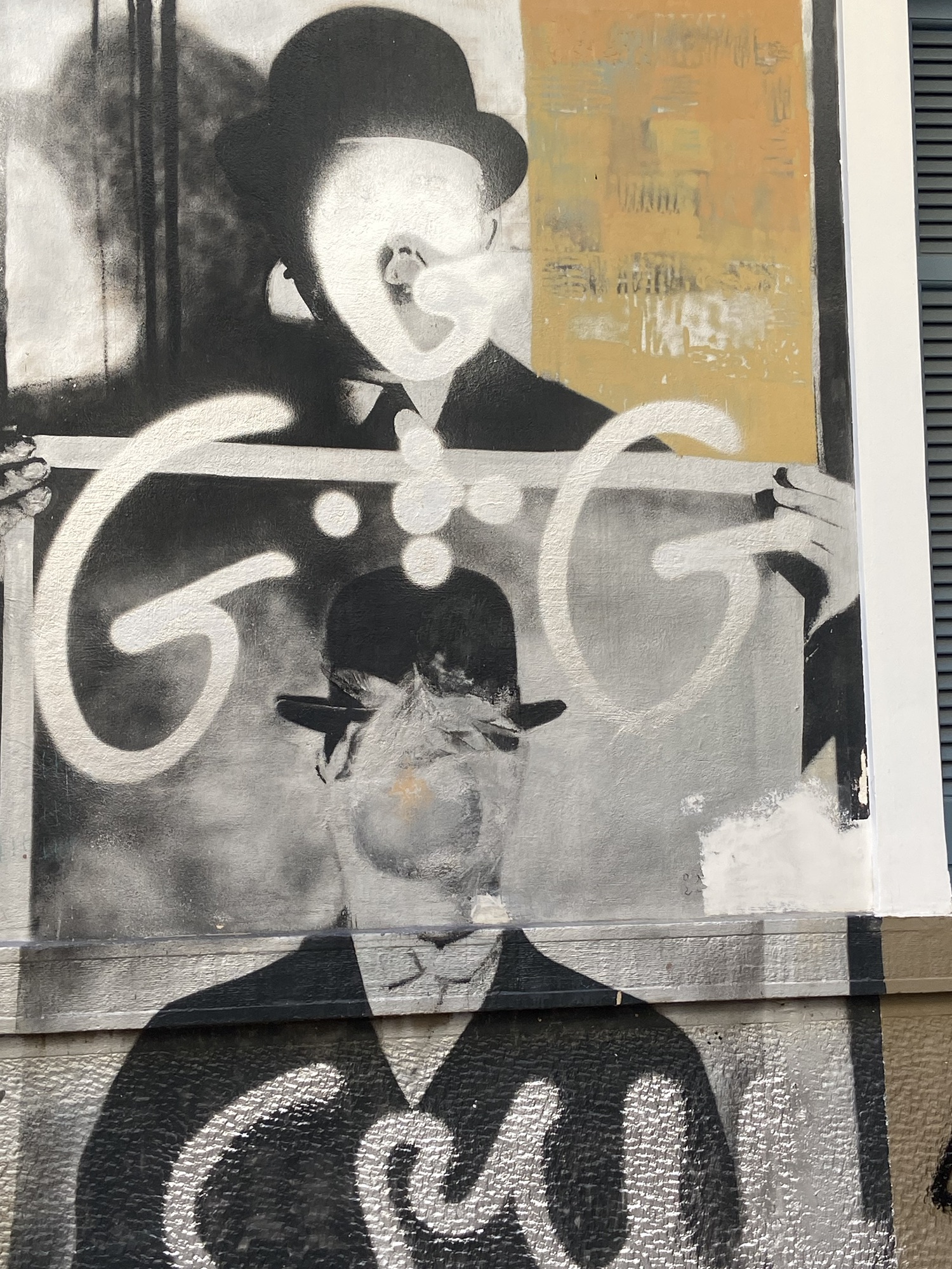 One more (“I write entirely to find out what I’m thinking” — John Dickerson quoting Joan Didion, and speaking to my condition this morning, as this blogpost testifies to!). It’s that luxury of being able to photograph what a recent tagger did to the best piece of graffiti on my street. I’ve nodded at that rif on Magritte’s iconic painting for years — as I’m sure Elizabeth and Teresa have as well, when they’ve been here. Probably photographed it, as I have, too, back in the day.