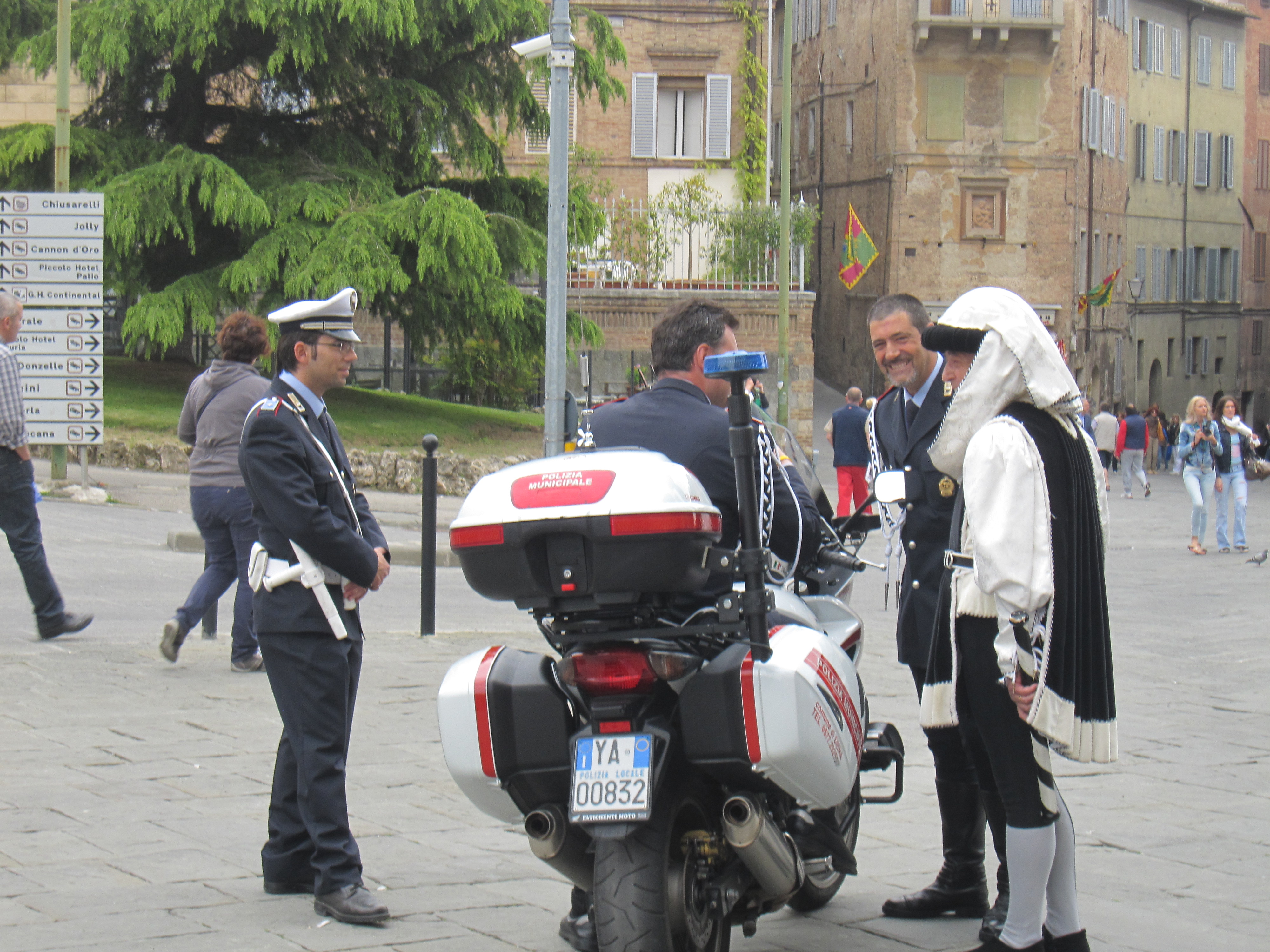 In their aqua suits,Volunteer Vets and Vet Techs (I THINK that’s what their badges said) are a colorful group, and watchful. I saw one injury, and it wasn’t to a horse: because the Mossiere (Starter) hesitated for a second when he dropped the <canape, to signal the start of the race, 2 of the jockeys flew over the heads of their horses. A minute later, several Misericordia (EMT) pushed passed me with one of the jockeys: a broken finger! These professional bareback-riders are slight, steely-eyed men, and while the broken finger kept out the contrade of Chiocciola’s rider this morning, everybody expects him back for tonight’s Prova.