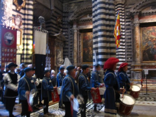 The procession into Catherine’s house lasted for 30 minutes. These black-and-whites represent none of the 17 contrade, but rather the Citta, the City of Siena.