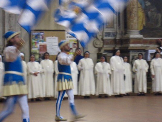 This post began as an email to Matt, my son who loves most things Italian and nearly everything Dominican. I wrote to tell him that the vigil for the festa of Saint Catherine of Siena had begun with great flourishes on Saturday. We could hear drums and bugles, and see the alfieri with their flags, all over the city….but as I had to tell Matt, Gmail wouldn’t let me load my video.