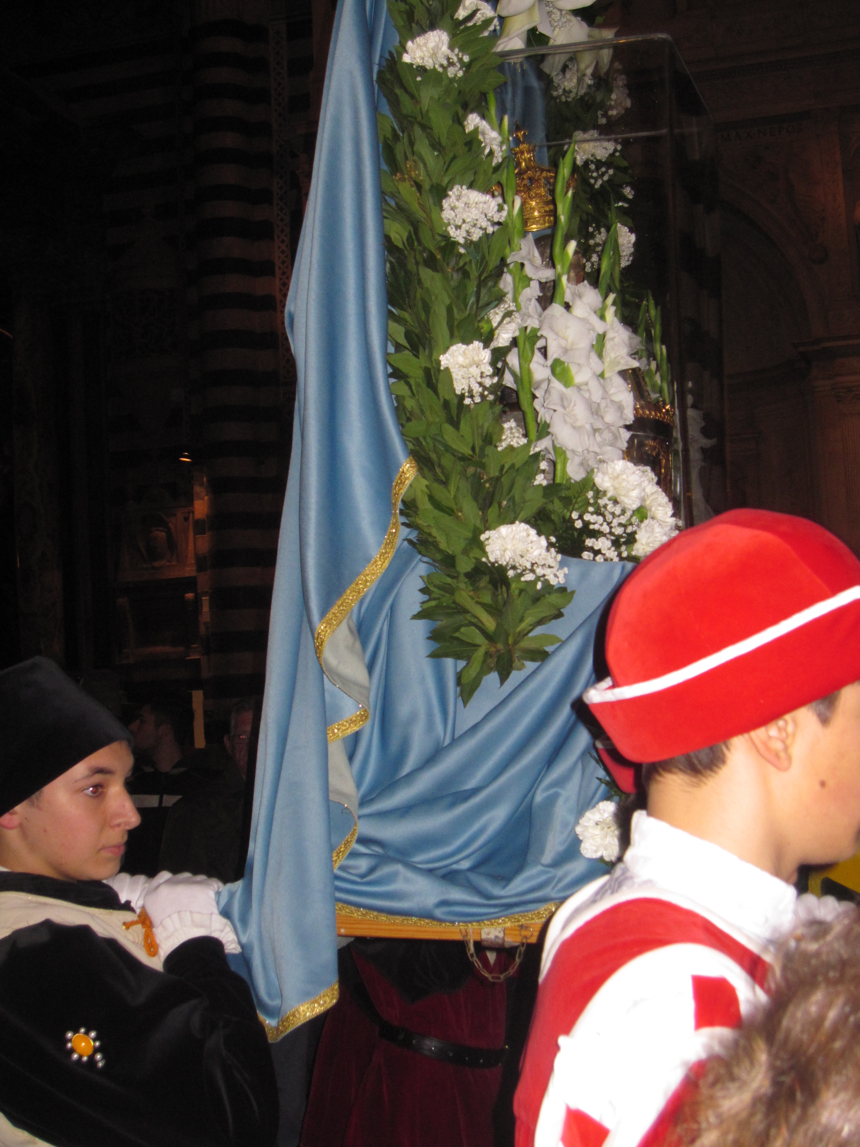 Finally, we joined the procession back to San Domenico with the great relic – not her head, which seems never to leave San Domenico, but her finger. Yes.