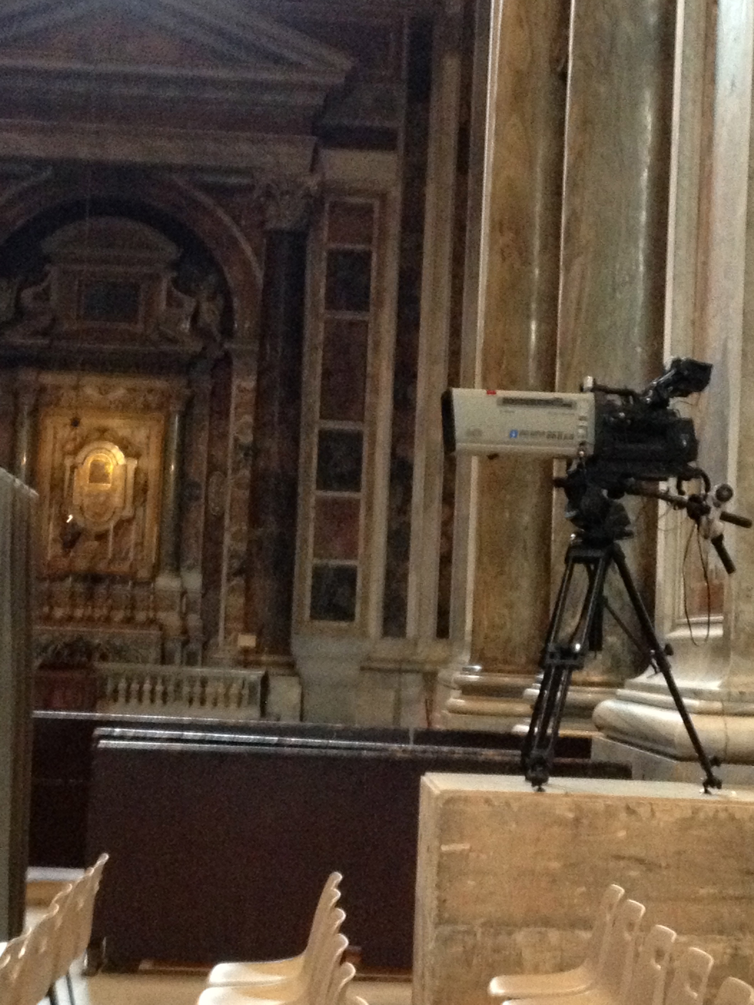 The piazza is as full of jumbotrons as it is of pilgrims this afternoon, and inside the basilica, cameras and chairs are going up.