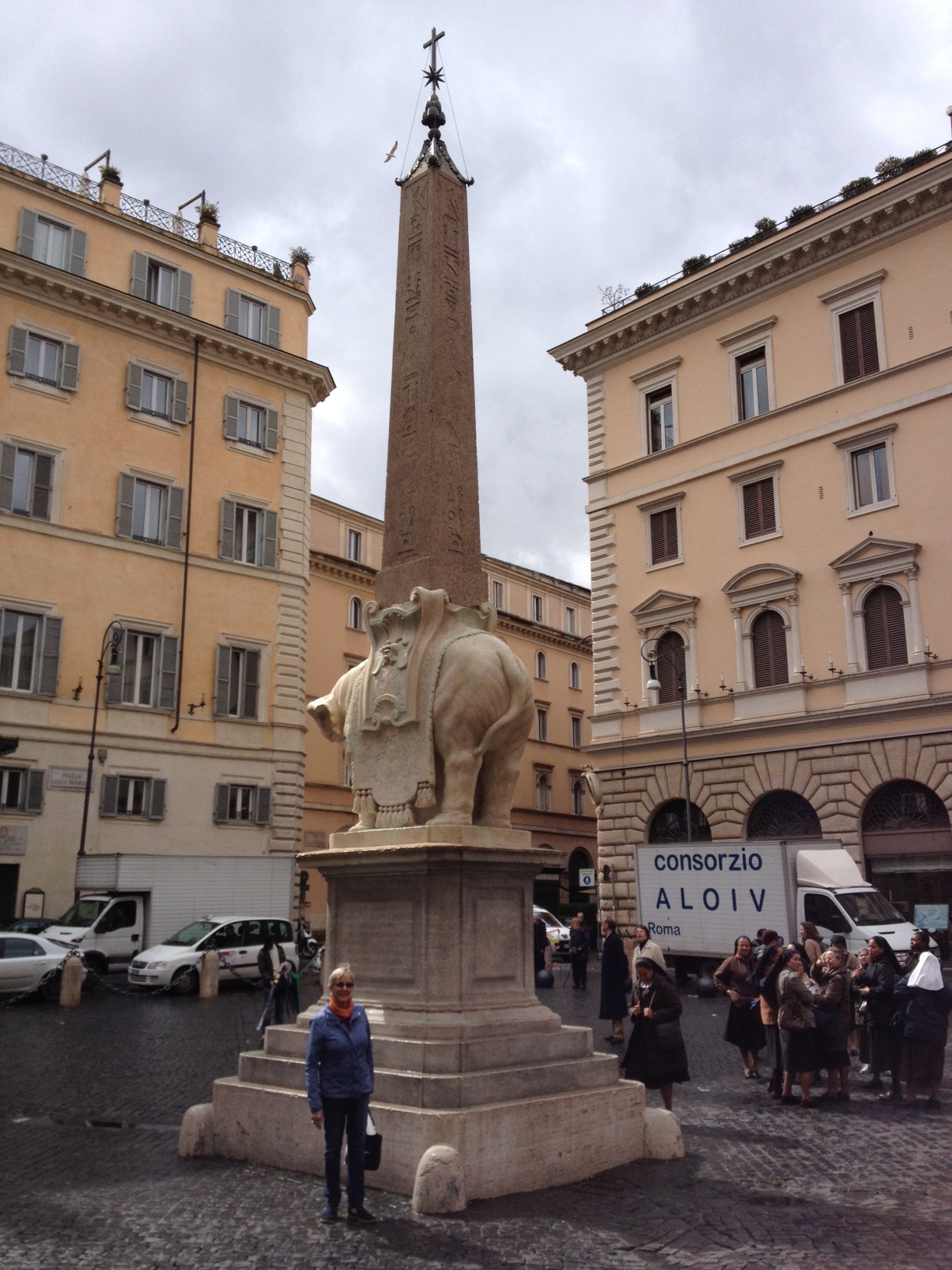 Around the corner from the Pantheon, I posed before Bernini’s elephant on Tommy’s birthday, and made some poor Englishman take my picture —
