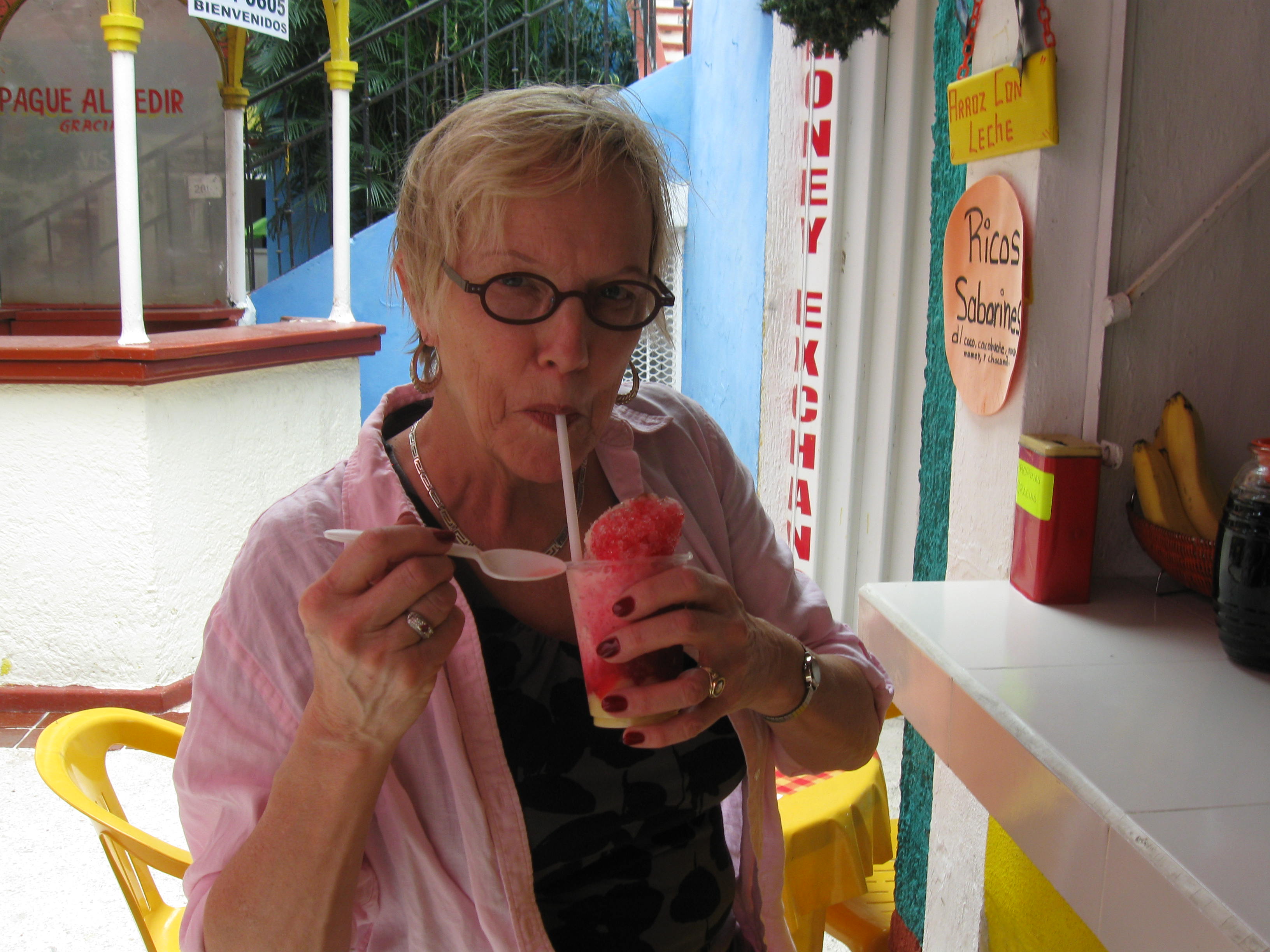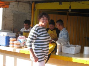 Going after that to the decidedly downscale Market 23 was a delight, peering through huge buckets of pottery, woven baskets, voodoo [sic]. It was the first market in Cancun – there are now over 20 supermarkets in Cancun. We sat down for lunch – the only Anglos – and between us managed to consume several soups, salads, and a chicken taco smothered in lime juice.